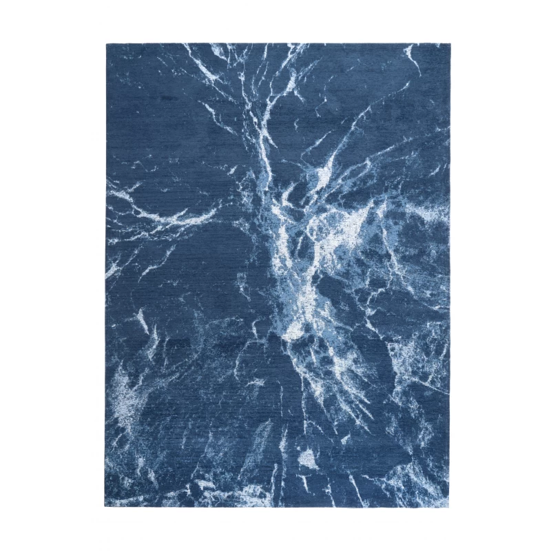 Tkany na krosnach tkaninowych dywan Atlantic Blue charakteryzuje się oryginalnym abstrakcyjnym wzorem w niebieskich barwach.