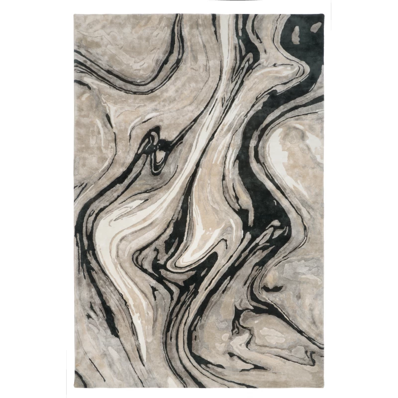 • Wzór dywanu łączy subtelnie kolory czerni, szarości, beżu i bieli, tworząc efektowny marmurowy motyw, który dodaje elegancji każdemu wnętrzu.
