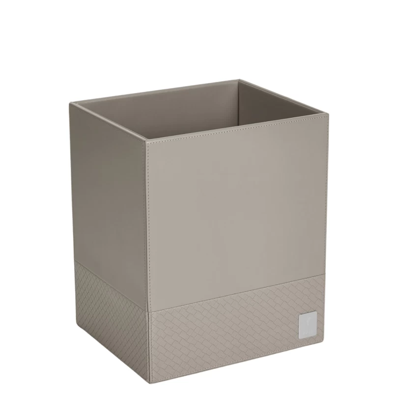 Światowej klasy design to coś, z czego słynie marka JOOP! i oferowane przez nią produkty. Nie inaczej jest w przypadku prezentowanego kosza na śmieci. Wykonany został z eleganckiej skóry ekologicznej w odcieniu piaskowej szarości. Wszystkie krawędzie zyskały ozdobne przeszycia podkreślające miękkość materiału. Dół kosza ozdobiony został dodatkowo wzorem plecionki wykonanym w tym samym materiale co reszta. W dolnym rogu umieszczona została lśniąca tabliczka z logiem marki i symbolem kwiatu chabru, która stanowi ciekawy element dekoracyjny.