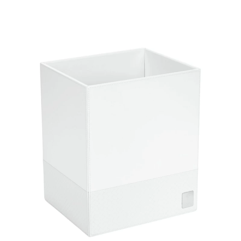 Światowej klasy design to coś, z czego słynie marka JOOP! i oferowane przez nią produkty. Nie inaczej jest w przypadku prezentowanego kosza na śmieci. Wykonany został z eleganckiej skóry ekologicznej w odcieniu czystej bieli. Wszystkie krawędzie zyskały ozdobne przeszycia podkreślające miękkość materiału. Dół kosza ozdobiony został dodatkowo wzorem plecionki wykonanym w tym samym materiale co reszta. W dolnym rogu umieszczona została lśniąca tabliczka z logiem marki i symbolem kwiatu chabru, która stanowi ciekawy element dekoracyjny.