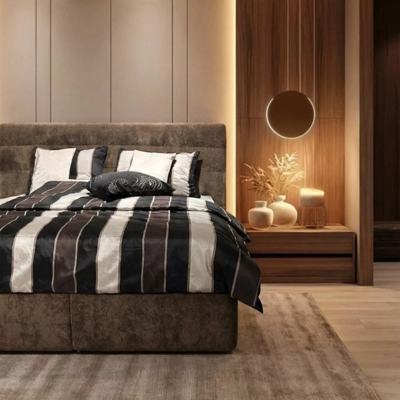 Tkanina FARGOTEX ZOYA 02, która została wykorzystana do obszycia bazy i zagłówka, ma właściwości plamoodporne i jest łatwa w czyszczeniu, co jest dużą zaletą dla łóżka Calypso. Dodatkowo jest też trudnopalna i posiada specjalny certyfikat Oeko-Tex Standard 100. Wybrany kolor tkaniny przedstawiony na zdjęciu sprawia, że łóżko nabiera delikatnego charakteru i nie wydaje się być toporne. Aby dobrać inny kolor tkaniny skontaktuj się z nami!
