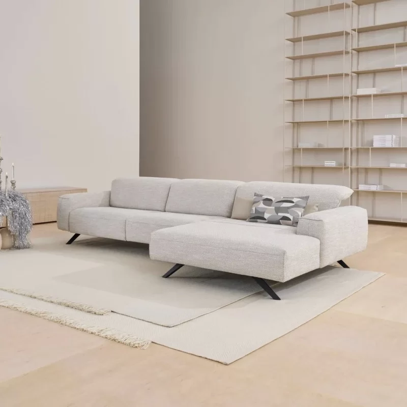Nowa, elegancka tkanina strukturalna o wyraźnym, grubym splocie powstała z połączenia szlachetnych materiałów: bawełny, lnu, wełny, wiskozy oraz poliestru. Efekt? Zmysłowa w dotyku, trwała i wyrafinowana powierzchnia, która wygląda luksusowo, a jednocześnie zaprasza, by usiąść „tylko na chwilę” (która zwykle kończy się całym wieczorem). Całość osadzona jest na wysokich, 17-centymetrowych nóżkach w kolorze antracytowym lub stali nierdzewnej dodających lekkości i nowoczesnego charakteru. Manualnie regulowane zagłówki pozwalają z kolei znaleźć idealną pozycję do rozmów, relaksu czy seansu filmowego.