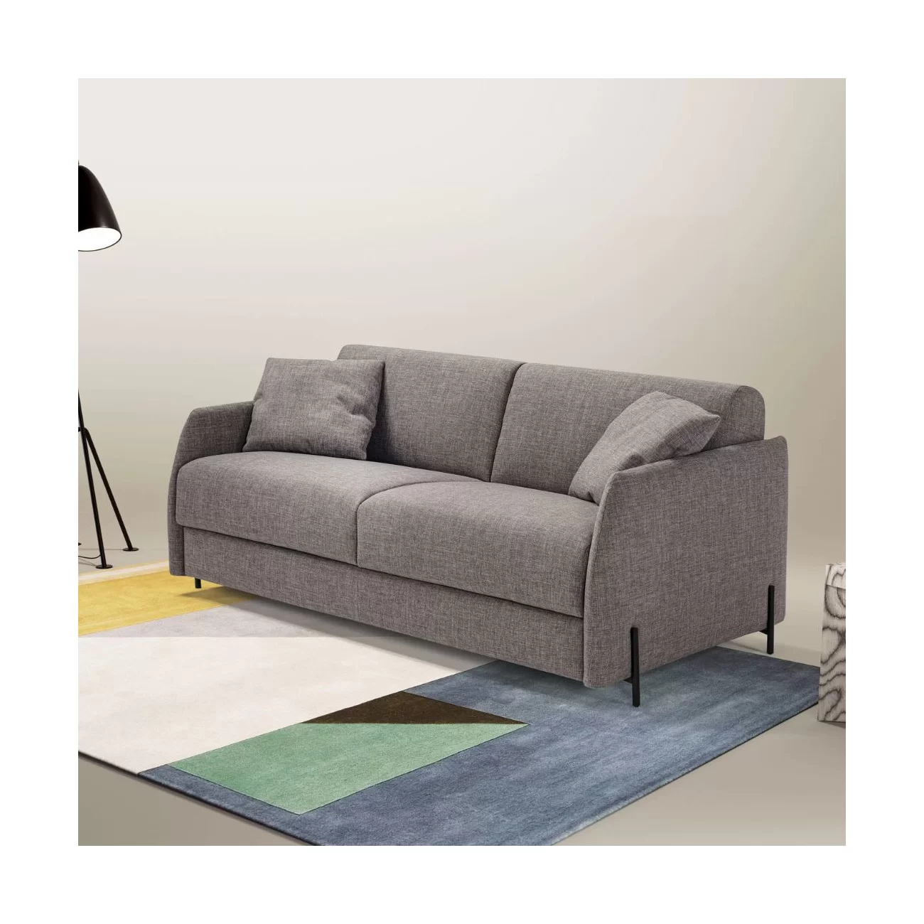 Sofa została zaprojektowana z myślą o wnętrzach loftowych, modernistycznych i minimalistycznych. Prosta bryła, osadzenie bliżej ziemi oraz czarne designerskie nóżki o wysokości 8 cm podkreślają jej nowoczesny charakter. Wbudowany mechanizm włoski umożliwia szybkie rozłożenie, a komfort snu zapewnia gruby materac poliuretanowy D30 o wysokości aż 17 cm – idealny do spania na co dzień.